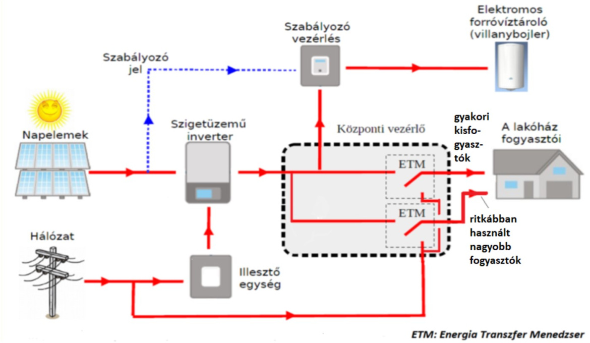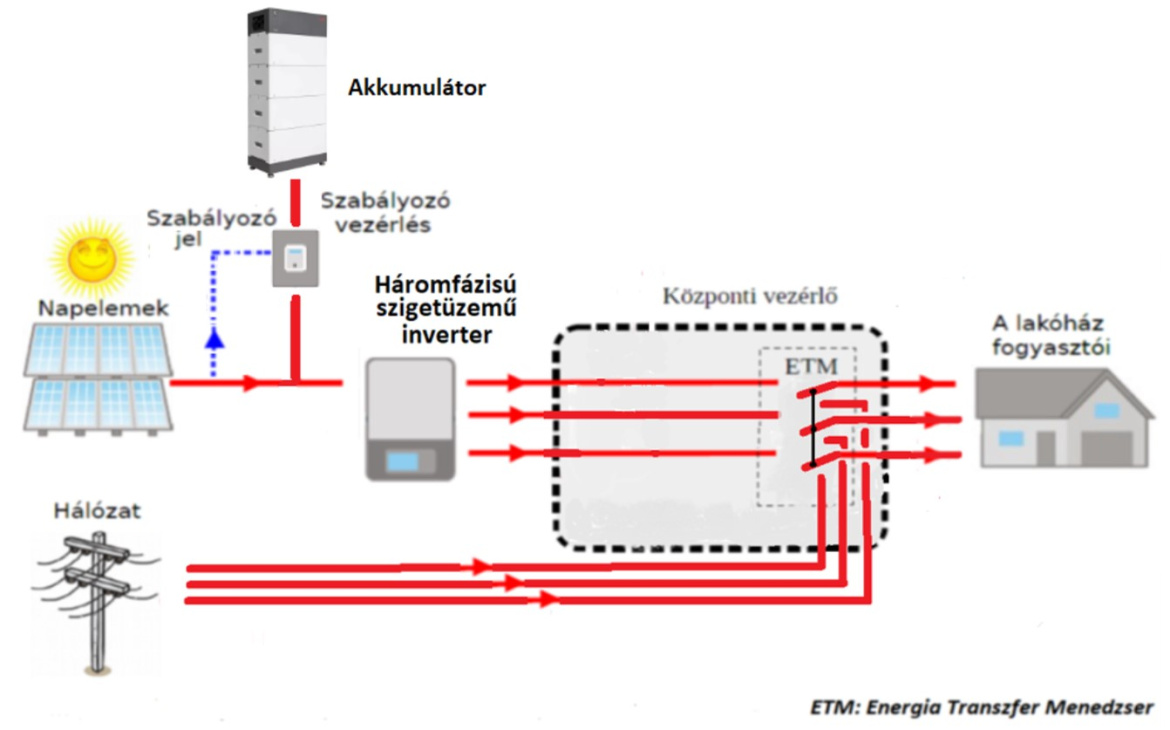 Képes a két megújuló energiaellátási csoportra osztott egyfázisú fogyasztók egyik csoportját megújuló energiával ellátni, míg a másik csoportot a több megújuló energia hiányában hálózatról látja el